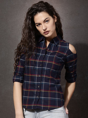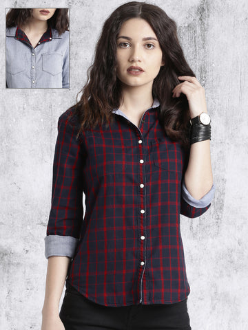Women Peach & Purple Slim Fit Checked Casual Shirt