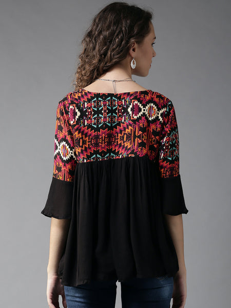 Black and orange printed woven A-line top, has a notched round neck, three-quarter sleeves,